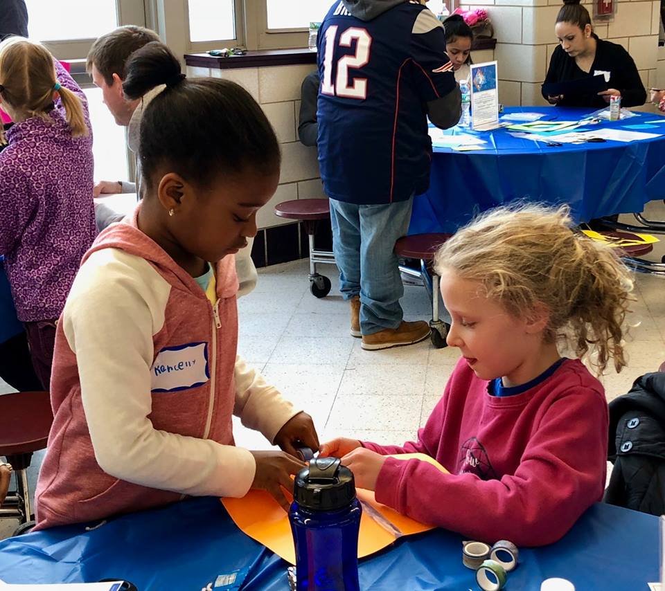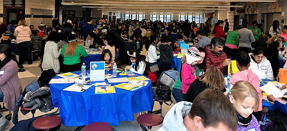 THANK YOU to the volunteers from all over Massachusetts that banded together to form a Boston Cares community dedicated to supporting local immigrants and refugees. Volunteers collectively made more than 200 ESOL learning kits made to function as storage lap desks, each equipped with a magnetic whiteboard, dry-erase marker, magnetic sound and grammar tiles, an ESOL writing journal, and civics flash cards. In addition to these lap desks, the school cafeteria housed groups of four working to create sets of conversation jenga that will be used in ESOL classrooms. With painted ends that represent different levels of English and questions on stickers ranging from silly to serious, these little wooden pieces are meant to build bridges that bring volunteers and students together.